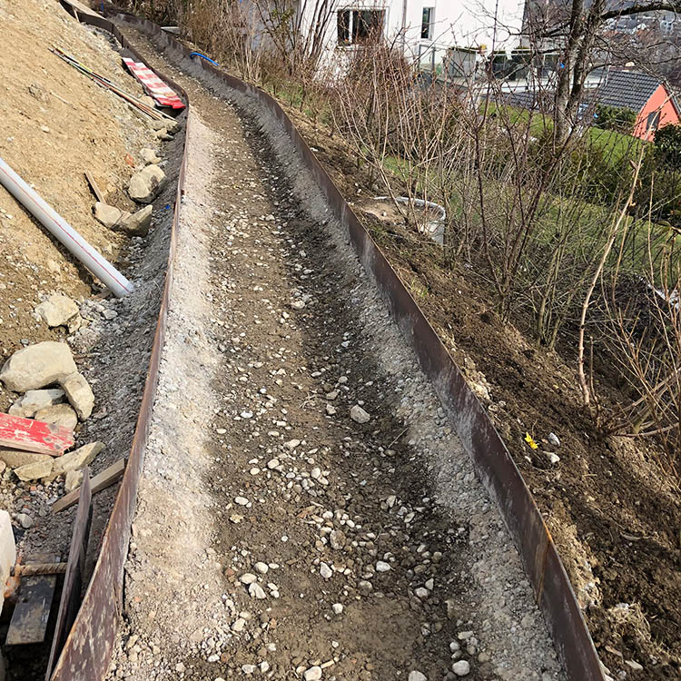 Baugrube, Böschungssicherungen, Bohrpfähle, Anker, Rühlwand, Kanalisation, Werkleitungen, Magerbetonsohle, Hinterfüllungen, Pflästerungen, Strassenbau, Belagsarbeiten, Umgebung